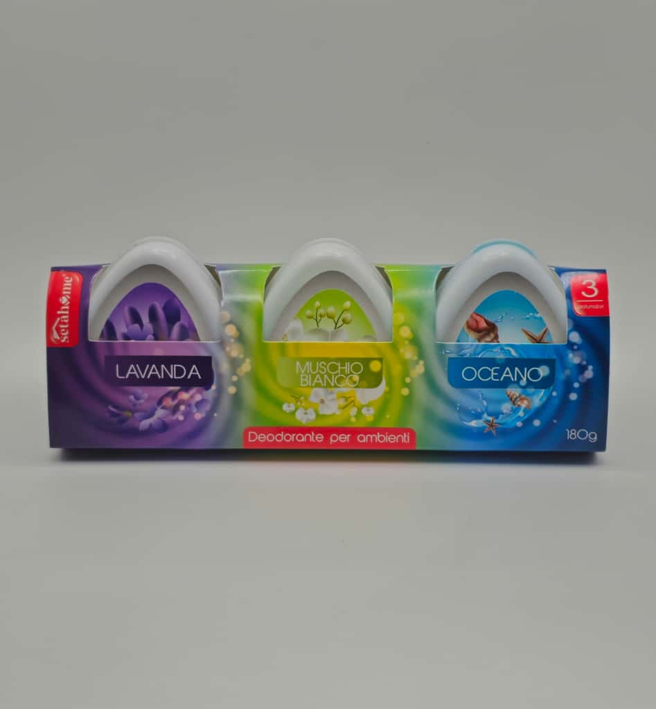 Rinfresca e profuma ogni ambiente con il set da 3 deodoranti per ambienti da 180g, disponibile nei delicati aromi di lavanda, muschio bianco e oceano. Ogni fragranza è studiata per eliminare gli odori sgradevoli, creando un’atmosfera piacevole e accogliente in casa o in ufficio. Facili da utilizzare, offrono una soluzione pratica e duratura per un ambiente sempre profumato e invitante. Scegli il tuo aroma preferito o l’intera selezione per un’esperienza multisensoriale che migliora il comfort quotidiano.